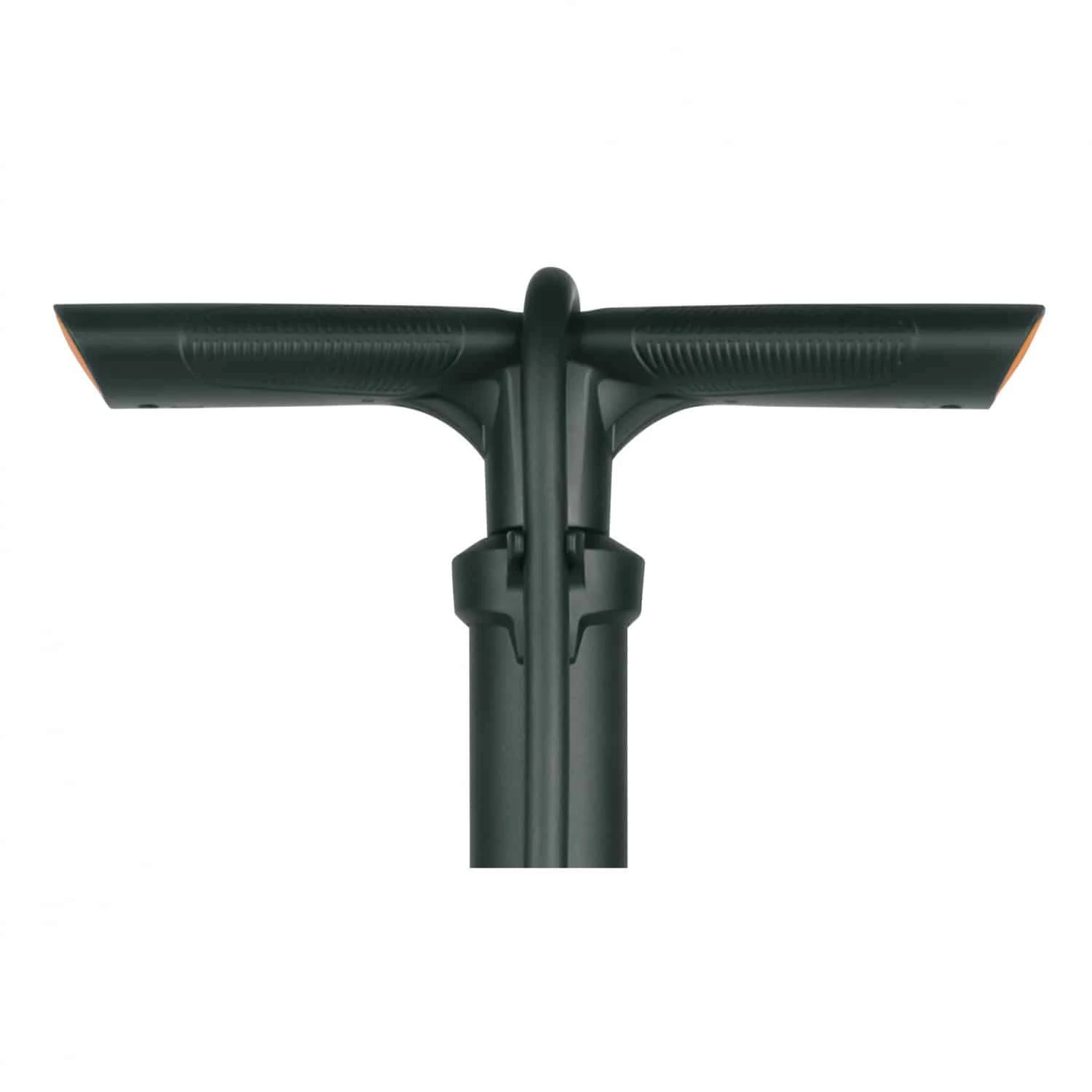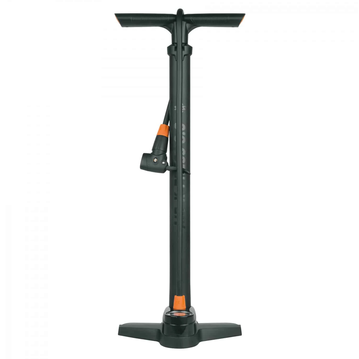 schwarz-orangefarbene Fahrradpumpe wird aus Kunststoff gefertigt und ist 60 Zentimeter